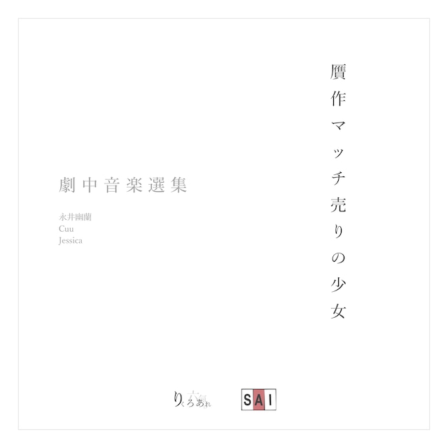 -     【CD】贋作マッチ売りの少女「劇中音楽選集」 ¥2,310 2017年11月4日より三都市に渡るツアー公演を駆け抜けた「贋作マッチ売りの少女」。 その劇中音楽を閉じ籠めた、音楽CDです。 *ツアー期間中に販売された会場限定版とは外装の仕様が異なります。 ・収録楽曲・ 1. (intro.) 2. song for Aruru 3. 箱庭の薔薇 4. 死のゆび 5. 鋭鈍 6 幻想都市ロンドン 7. 白夜 8. 次に会うときには別人の顔で ・興行詳細・ りくろあれ × 舞台芸術創造機関SAI 幻想音楽劇【贋作マッチ売りの少女】 劇作:倉垣吉宏 演出:SAI 歌唱:大島朋恵 音楽:永井幽蘭 Cuu- Jessica 音楽総括:りくろあれ ――– 画家ヴァン・ゴッホは贋作稼業を生業としていた。 ある日、オークション会場で美しい少女、アルルと出会う。 彼女は“マッチ売りの少女”と呼ばれる娼婦であり、歌姫。 ヴァンは、少女に絵のモデルを依頼するが金が無いことから断られてしまう。 丁度その頃、腹違いの弟であるジオからルームシェアの提案を受ける。 相手は画商であり画家であるポール・ゴーギャン。 強烈な個性を持つ2人は、互いに惹かれあっていくが・・・ この作品は、情熱の画家“ヴァン・ゴッホ”の短い生涯を描いた幻想音楽劇である―。 ――– 栃木公演:南宇都宮 悠日 2017年11月4日(土)・5日(日) 東京公演:江古田 アトリエサードプレイズ 2017年12月9日(土)~17日(日) 神奈川公演:若葉町 ウォーフ 2018年2月3日(土)・4日(日) ――–